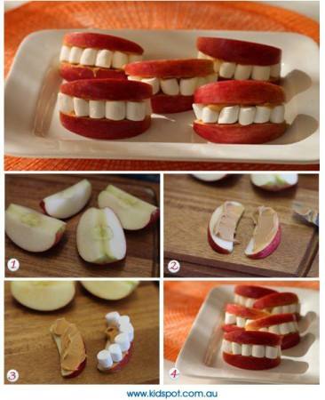 Ragasztgassunk rájuk pillecukrot, és borítsunk rá egy másik szelet mogyoróvajjal megkent almát.