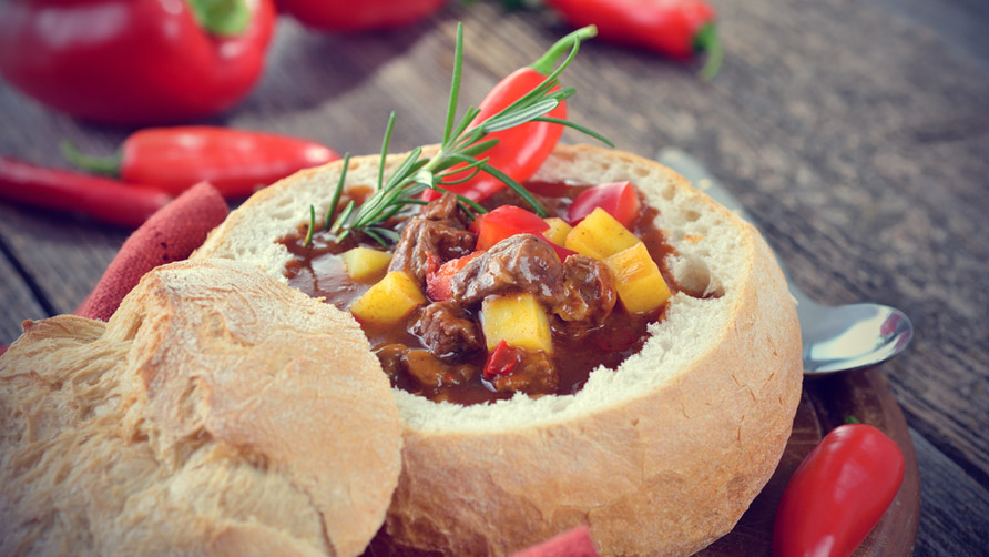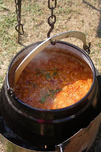 Az apróra vágott hagymát zsíron megpirítjuk. Lángról levéve hozzáadjuk a paprikát, elkeverjük, kevés vízzel felengedjük és visszatéve kissé zsírjára sütjük. Az egyenletes kockára vágott húst beletesszük, elkeverjük, sózzuk. Fedő alatt, mérsékelt tűzön pároljuk. Ha elfőtte saját levét, kevés forró vizet öntünk rá. Párolás közben hozzáadjuk a szétzúzott fokhagymát és az apróra vágott köményt. Amikor majdnem puha, hozzáadjuk az apró kockára vágott burgonyát és addig pároljuk vele, amíg a burgonya üveges lesz. Ugyancsak ekkor adjuk hozzá a zöldpaprikát és a friss paradicsomot (vagy lecsót). Felengedjük vízzel a kívánt mennyiségre, utána sózzuk és az egészet puhára főzzük: Külön kifőzött csipetkével tálaljuk.