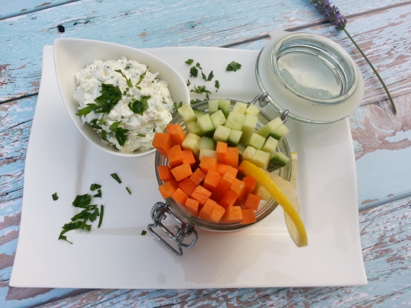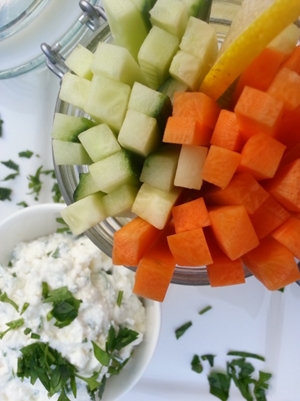 Könnyű, diétás nassolnivaló vagy egy kerti parti előétele lehet ez a zöldfűszeres sajtkrém roppanós zöldségekkel. Nyári melegben jól esik nyers, friss zöldségeket rágcsálni. Válasszuk a magas víztartalmú uborkát, de lehet benne még paprika, répa vagy szárzeller is.