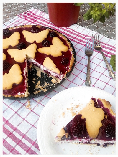 4. Már csak annyi a dolgunk, hogy a korábban kisütött tészta formákat a zselé tetejére illesszük és tetszés szerint egész szeder szemeket helyezzünk fel mellé.