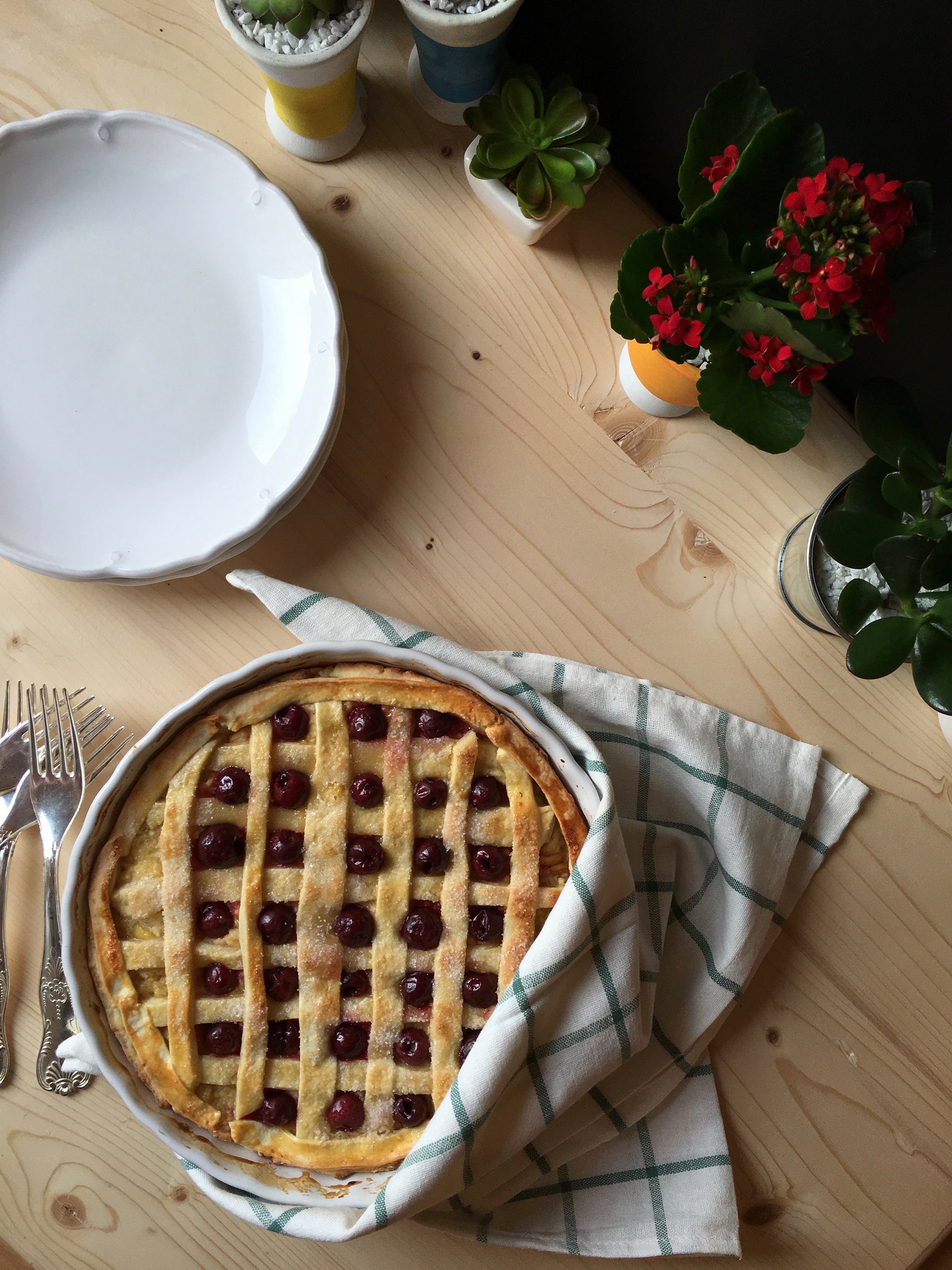 Én a fagyasztóban találtam még egy kis magozott meggyet, a rácsok közé az került. A tetejét megkentem a maradék tojással, majd két evőkanál cukorral meghintettem, és 12 perc alatt már készre is sütöttem.